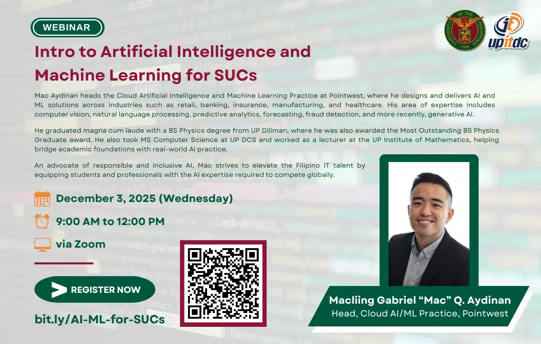 The UP Information Technology Development Center (UP ITDC) invites State Universities and Colleges (SUCs) to a FREE WEBINAR on Introduction to Artificial Intelligence (AI) and Machine Learning (ML) for SUCs. Mr. Macliing Aydinan of Pointwest will be discussing the topic and sharing his expertise.